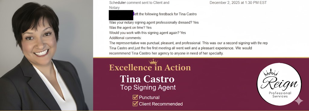 We are thrilled to share that Reign Professional Services has received a wonderful positive review! Thank you to our amazing clients for your trust and support. Your feedback motivates us to continue providing the highest quality of notary signing services. We pride ourselves on being dedicated, professional, and efficient in every signing we handle.